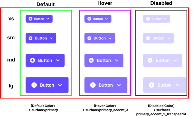 default 색상은 surface/primary, hover 색상은 surface/primiary_accent_3, disabled 색상은 surface/primiary_accent_2_transparent와 같이 시스템화시킬 수 있다.