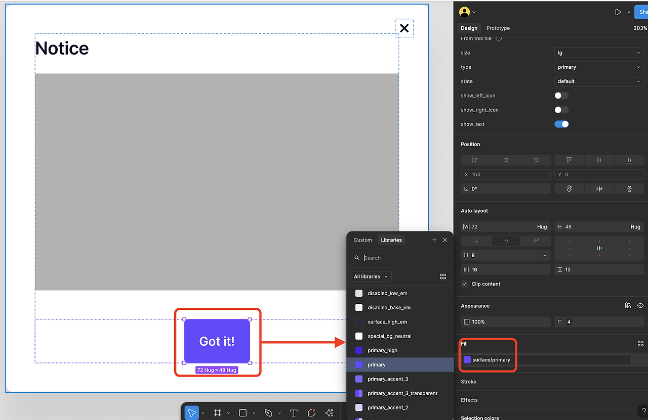 이제 피그마에선 Foundation에 정의한 컬러 정보에 그대로 대응할 수 있게 되어 실제 디자인 시스템에서 작성된 컴포넌트나 서비스별 디자인 시안에서 사용되는 컬러값은 토큰을 기준으로 작성되기 때문에 디자인과 개발 간의 괴리감이 없어지게 된다.