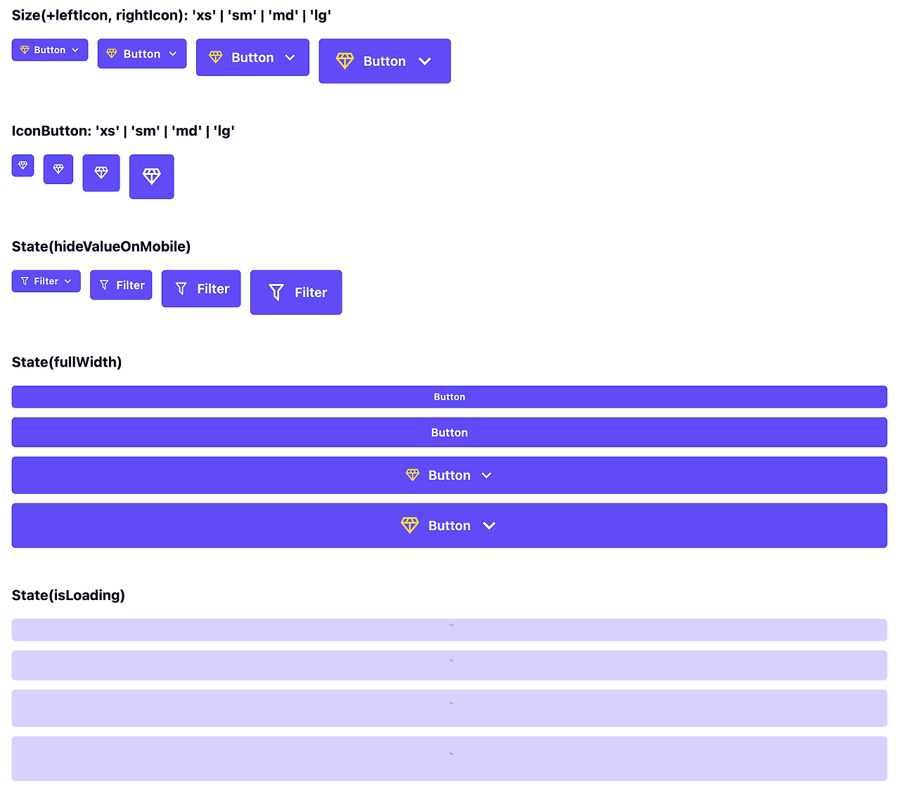 }이제 사용하는 곳에서는 HTMLButtonElement타입을 그대로 받을 수 있게 하여 button 태그의 속성, 이벤트 핸들러, aria 등 모두 적용이 되도록 하고, props로 내려받는 color, size 등에 따라 내부에서 지정한 컬러와 크기, 아이콘 등을 규격화해서 사용이 가능해진다.