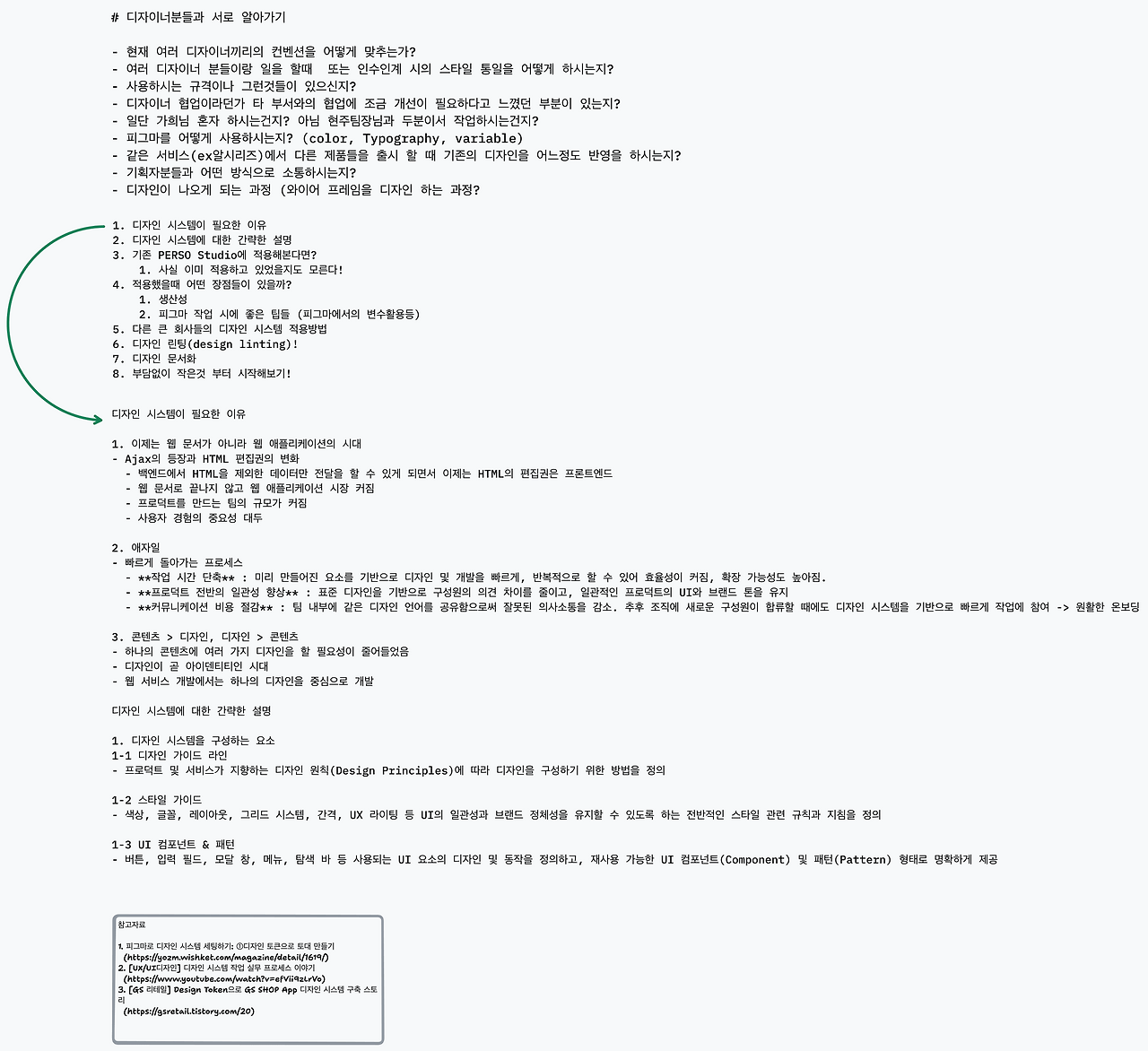 2주간 지속적으로 공유하고 정리된 내용을 기반해서 디자인 시스템의 개념과 의미에 대해 동기화를 진행했다.