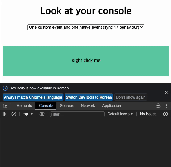 콘솔을보면, 처음 클릭 결과 값과 다음 클릭 결과 값이 다른 것을 확인 할 수 있다. 이렇게 CustomEvent와 Natvie 이벤트가 결합된 상황에서pointerdown와 contextmenu의 이벤트가 별도로 동작해야 각각의 이벤트 별로 사용자 제어가 가능하다.